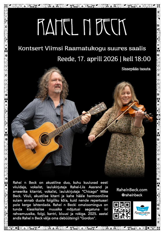 Kontsert: Rahel n Beck Reedel, 17. aprillil kell 18 raamatukogu suures saalis Kui sa ei soovi pildile jääda, siis anna sellest pildistajale teada Kontsert: Rahel n Beck Rahel n Beck on akustiline duo, kuhu kuuluvad eesti viiuldaja, vokalist, laulukirjutaja Rahel-Liis Aasrand ja ameerika kitarrist, vokalist, laulukirjutaja "Chicago" Mike Beck.