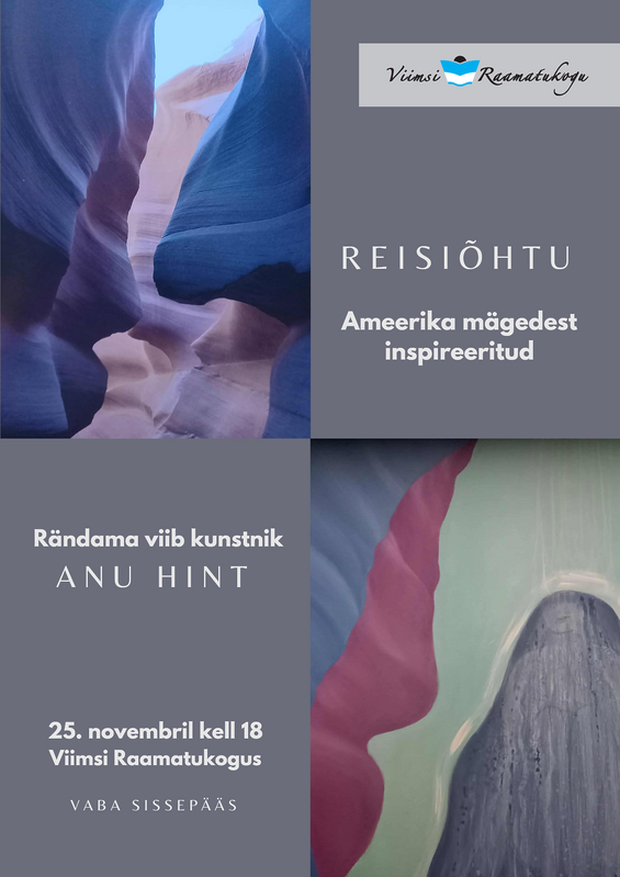 Anu Hindi reisiõhtu 25. novembril kell 18 raamatukogu suures saalis Vaba sissepääs, oled lahkesti oodatud! Novembris on raamatukogus üleval ka Anu Hindi isikunäitus Anu Hindi reisiõhtu Vaba sissepääs, oled lahkesti oodatud!